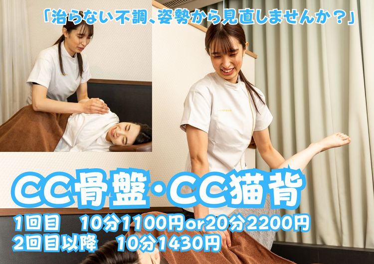 「自分の体が今どうなっているのか知りたい」そんなお声にお応えして、4月は姿勢改善強化月間を開催します! 土台となる骨盤と、見た目を左右する背骨をセットでケア。 「CC骨盤・CC猫背」メニューが、2回目以降の方も10分1,430円と通いやすい価格で提供中です。 「マッサージに行ってもすぐ戻ってしまう」…